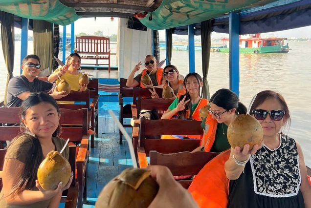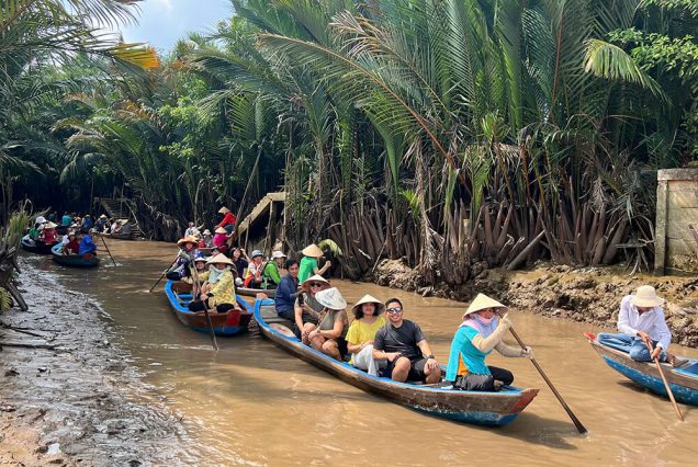 Take a hand- rowed sampan through the creeks for sightseeing the natural water coconut trees a symbol in the Delta areas.